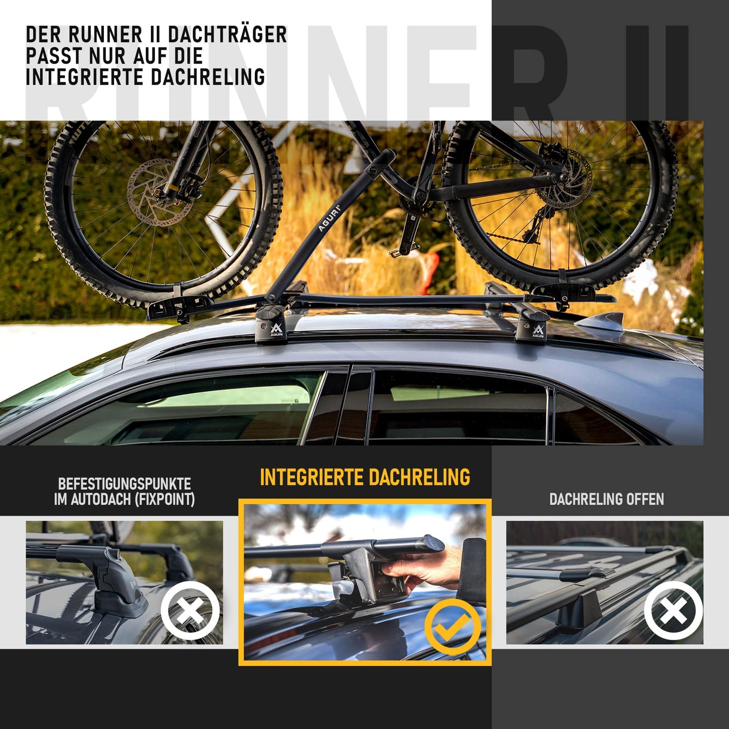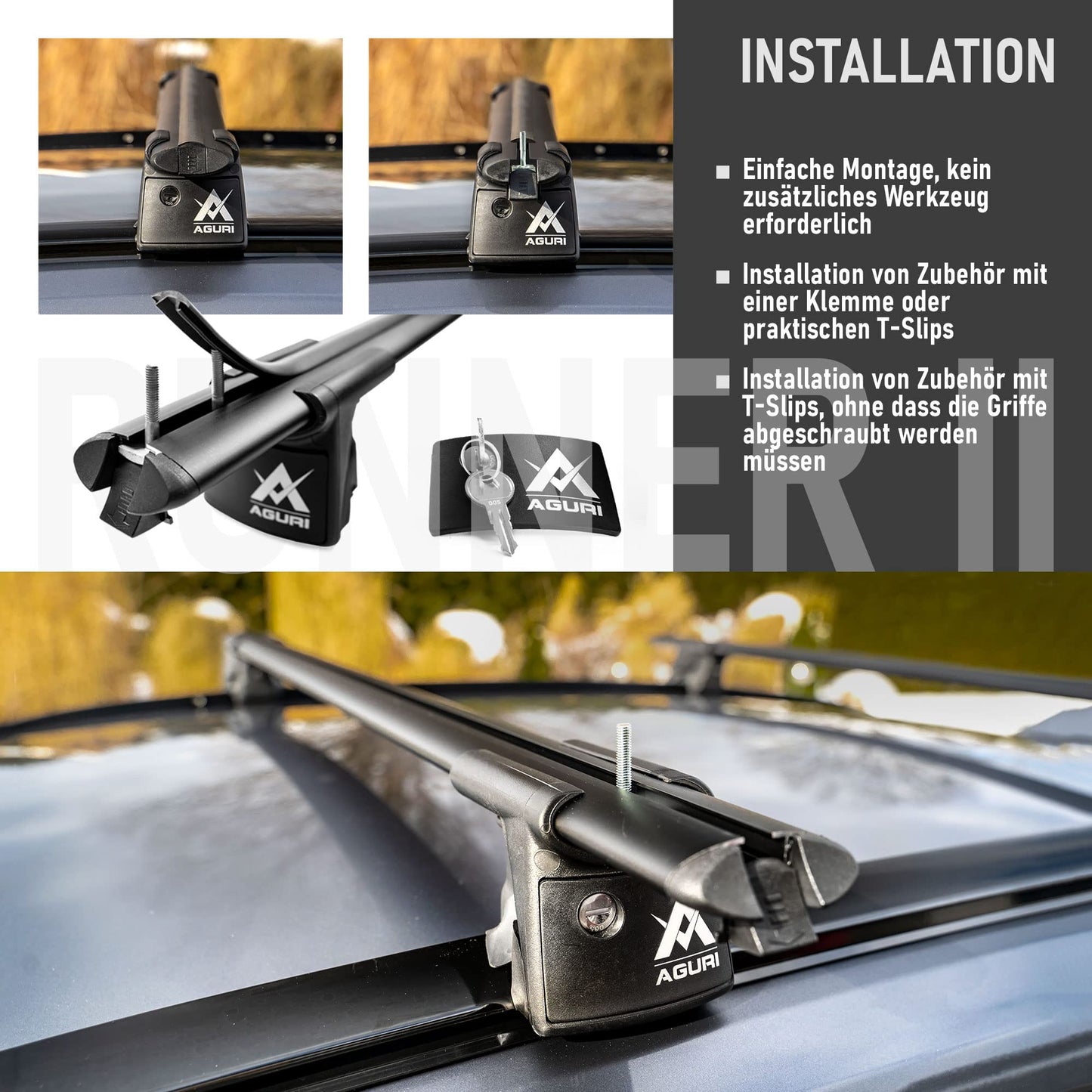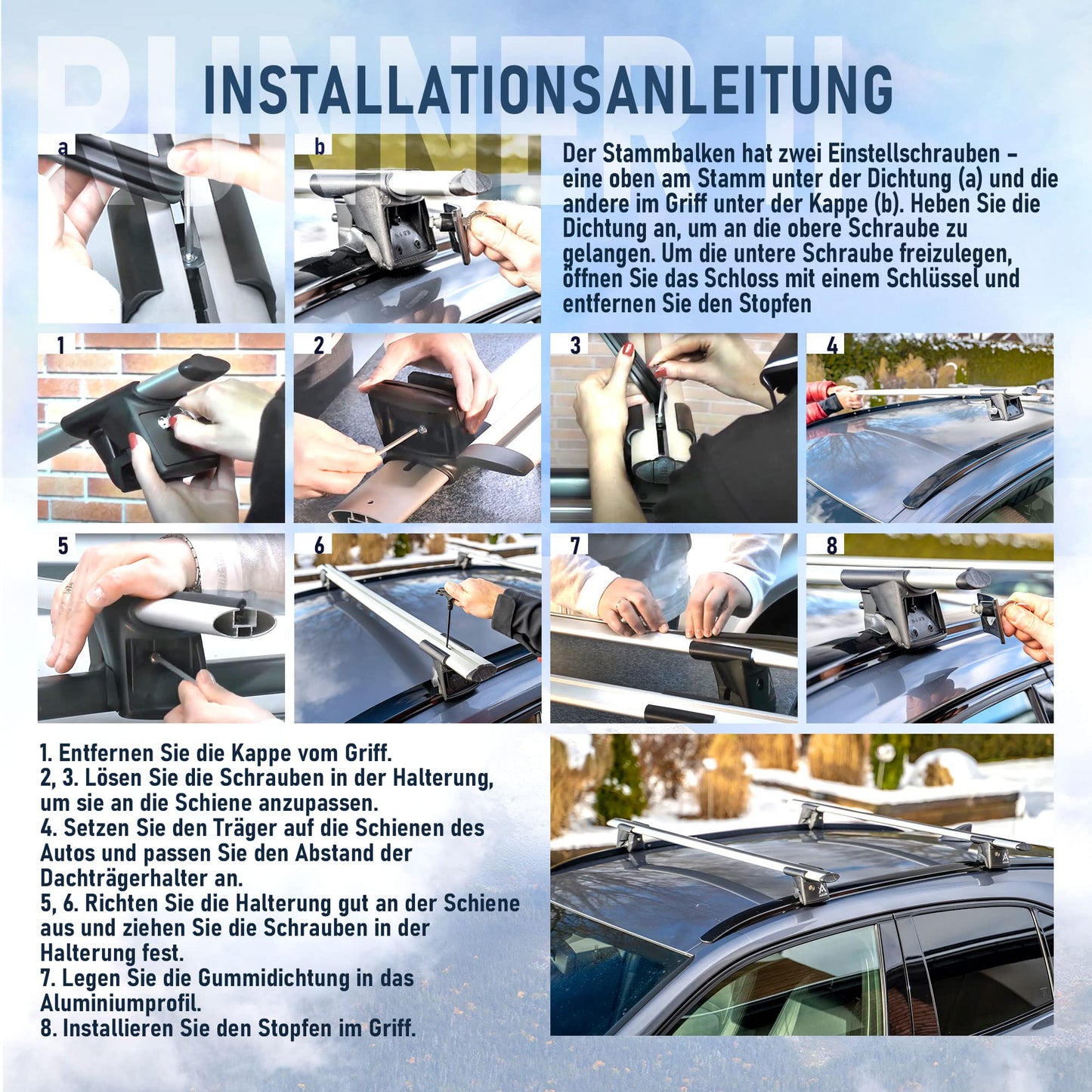 ➡️ Auf dem Dachreling bringst du einen Dachkoffer, Fahrraddachträger, Kajak, Leiter, Dachkorb; Anbringung mittels einer Schelle oder praktischer T-Nut-Adapter